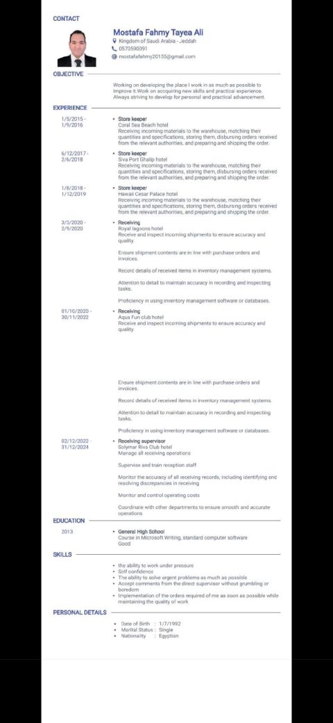 ابحث عن فرصة عمل مدير مستودع - أمين مستودع مشرف استلام - موظف استلام بالفنادق أو شركات الأغذية والمشروبات حيثى انني عملت بالفنادق لأكثر من 8 سنوات أمينا للمستودعات وموظفا للاستلام ومشرفا للاستلام