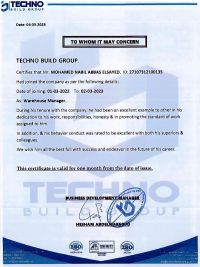 مدير مخازن واداري ومشرف عام مواقع وسكرتير تنفيذي ومحاسب خبرات متنوعة بكبرى مشروعات الدولة في مصر خبرات سابقة منها العمل مدير مخازن ومشرف عام مواقع بمشروعات رفع كفاءة الطرق بمنطقة شرق العوينات والداخلة وسانت كاترين والجلالة وأسوان وتوشكي والواحات في مصر مع كتيبة 73 طرق بالقوات المسلحة ومنها أيضا مدير مخازن مشروع القطار السريع بموقع رأس الحكمة والماسة في مرسى مطروح وفي العاصمة الادارية الجامعة الألمانية