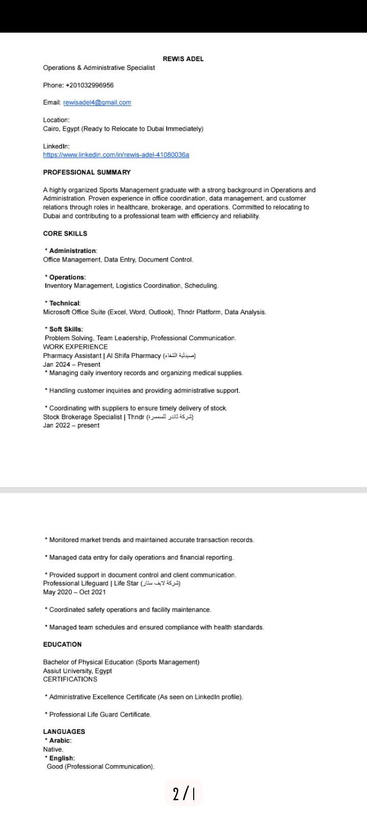 أنا الرويس عادل، خبرة 4 سنوات في العمليات والإدارة (ثاندر للسمسرة وصيدلية الشفاء) متمكن من مهارات الكمبيوتر وادخال البيانات. موجود حاليا في مصر وجاهز للسفر والعمل في دبي فورا
