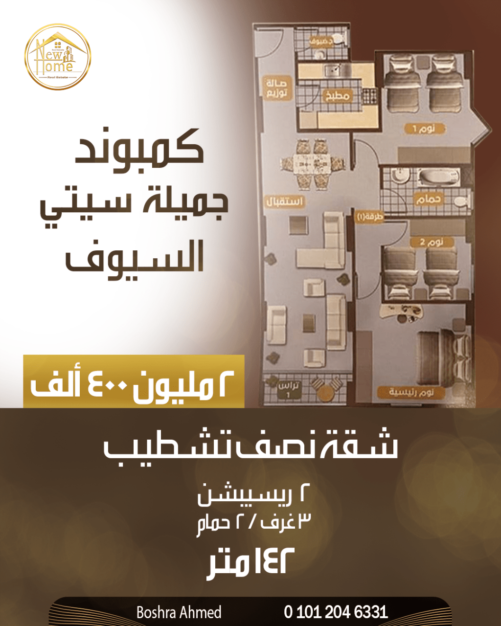 Apartment for sale, 142m - El - Seyouf Agent Bushra Ahmed 01012046331 - 3 bedrooms + 2 reception rooms + 2 bathrooms + 1 kitchen - 2nd floor, 11 - story building - 1 elevator - Licensed - Semi - finished - Meter (electricity, water, gas) 2400000 cash - Code 0103