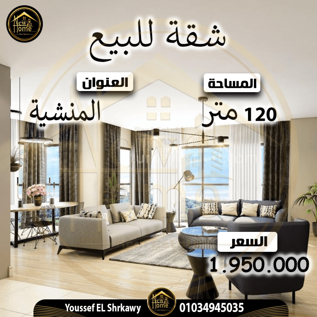 Apartment for sale,120 SQM - El Mansheya Agent Youssef El Sharkawy 01034945035 - 3 bedrooms + 2 reception rooms + 1 bathroom + 1 kitchen - 8th floor (building has 9 floors) 1 elevator - Licensed - Super Lux finishing - Electricity/ Water/ Gas meters installed - Code 0171