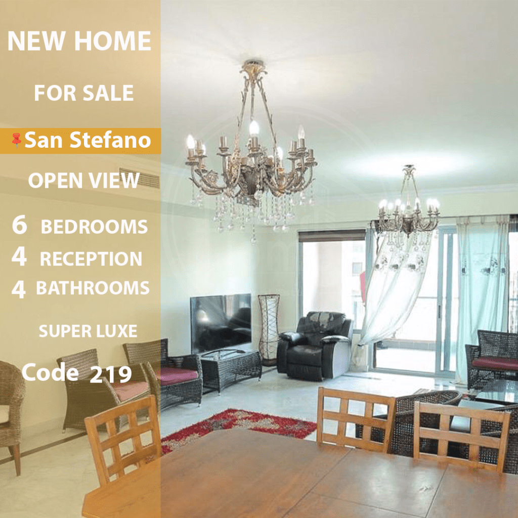 شقة للبيع 298م سان ستيفانو 4 سيذون 6 غرف، 2 ريسبشن، 4 حمام الدور 6، عمارة 36 دور تشطيب الترا سوبر لوكس شقة مرخصة، بناء 2010 كاملة عدادات عدد 4 مصعد فيو مفتوح علي البحر الكود 0219 - الوكيل/ روان محمود