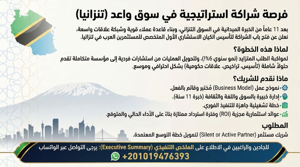 فرصة شراكة استراتيجية في تنزانيا بعد 11 عاما من الخبرة الميدانية وقاعدة عملاء واسعة، نطلق أول كيان استشاري مؤسسي للمستثمرين العرب في سوق ينمو بنسبة 6% سنويا. المزايا نموذج عمل مختبر، إدارة خبيرة باللغة والثقافة، وعوائد استثمارية (ROI) مجزية. المطلوب شريك ممول لدعم خطة التوسع المعتمدة. للاطلاع على دراسة الجدوى، تواصل معي