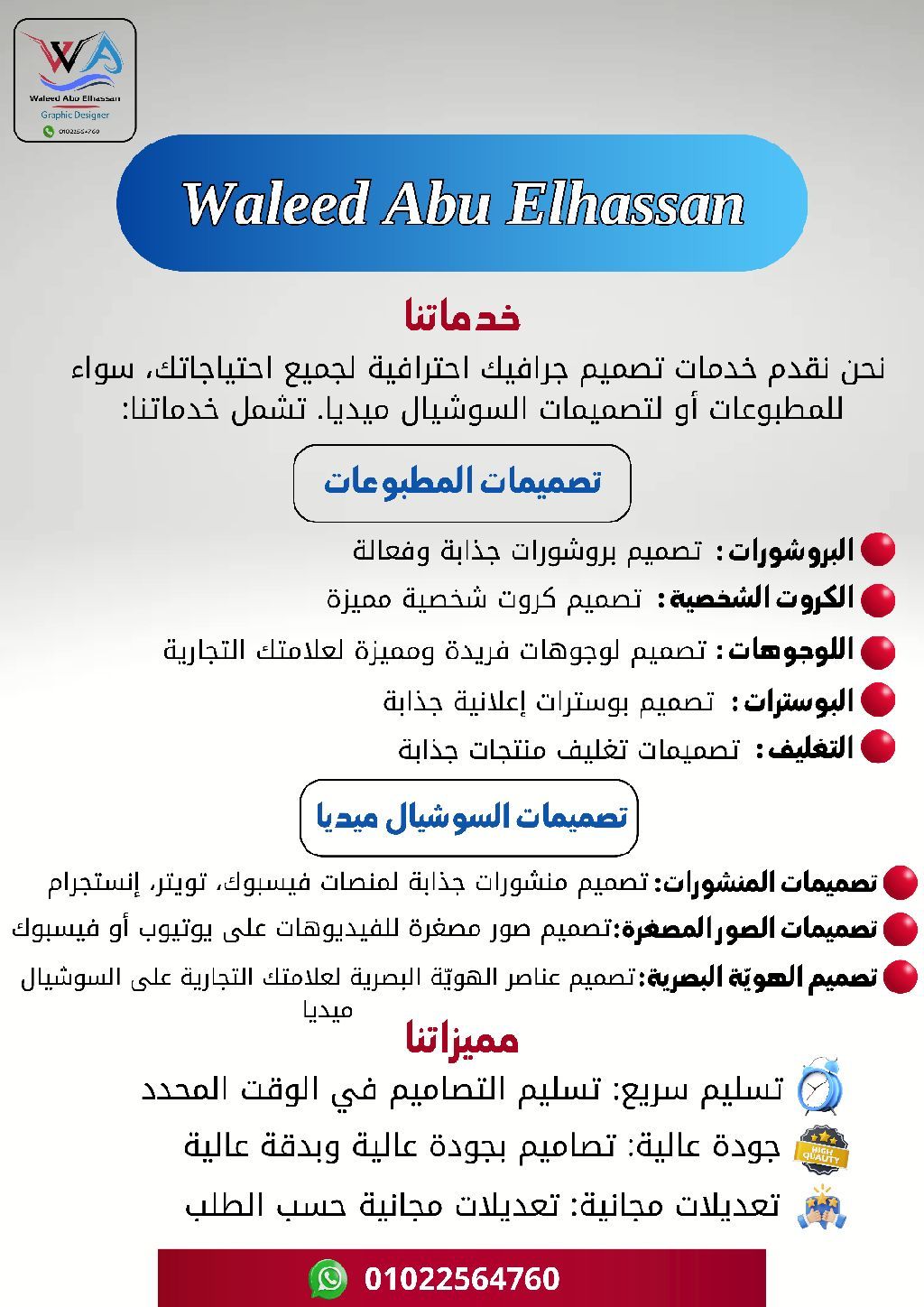 أنا وليد أبو الحسن. مصمم جرافيك متحمس وعندي شغف لأي Project اعمل عليه على شان يطلع بأفضل صورة وفي أقل وقت ممكن يسعدني تقديم خدمتي اليكم تصميم ملف تعريفي - بروفايل - اعلانات السوشيال ميديا. تصميم علامات تجارية (شعارات) تصميم الهويات البصرية. تصميم بروشورات - تصميم لوحات اعلانية. تصميم بطاقات العمل. تصميم CV عربي وإنجليش - تصميم شهادات تقدير - تصميم ID - تفريغ الصور للتواصل