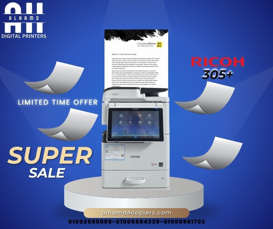 شركة - الحمد بتقد ملك أقوي طابعةات A3 المواصفات الفنية لماكينة Ricoh MP 305 - السرعة 30 صورة في الدقيقة. دقة الطباعة 600*600 dpi لضمان وضوح النصوص والصور. مقاسات الورق A5، A4، A3، مما يوفر مرونة في معالجة مختلف أنواع المستندات. وزن الورق المدعوم من 60 الى 163 جرام، التكبير والتصغير من 25% الى 400% - زمن التسخين 27 ثانية فقط، مما يوفر وقت الانتظار. زمن خروج أول ورقة 5 ثوان، وهو زمن مثالي لانجاز