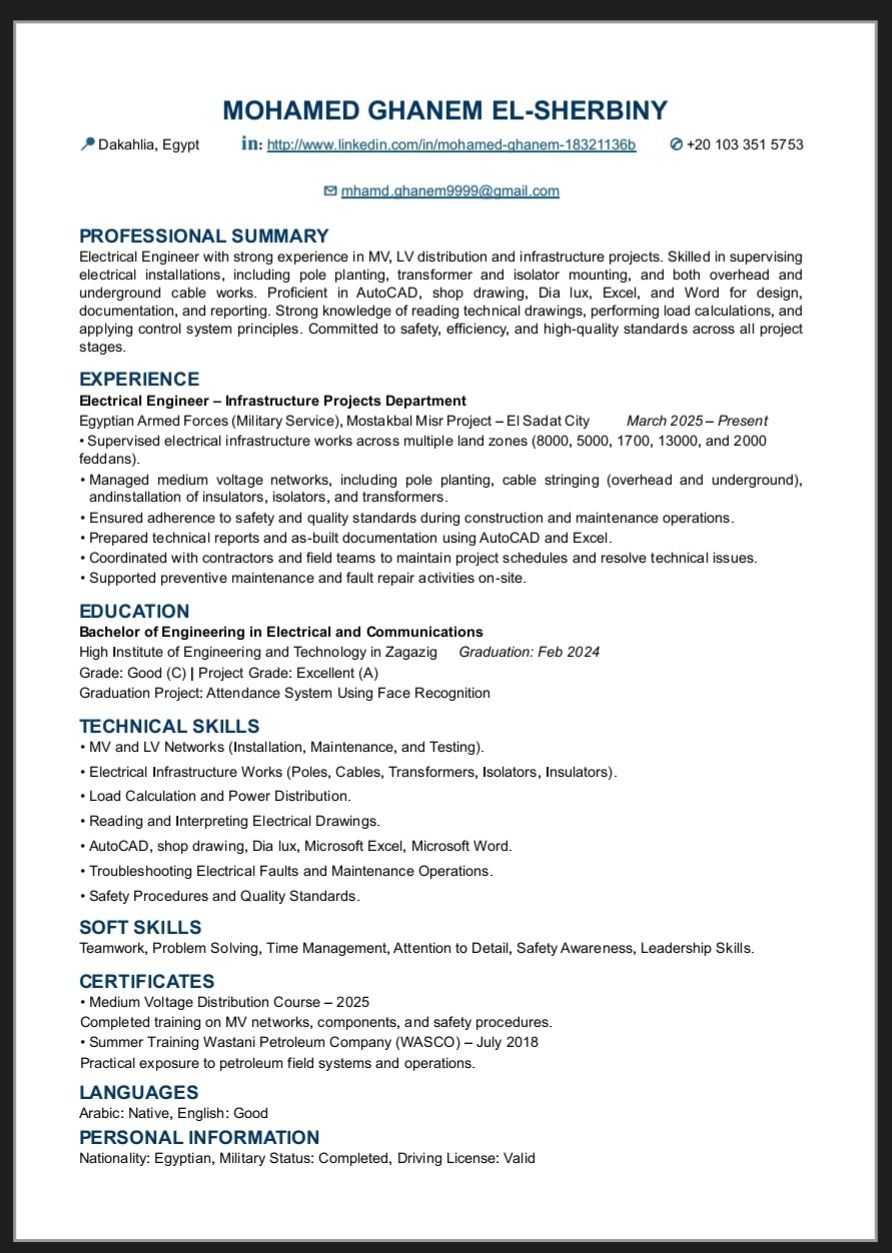 مهندس موقع كهرباء خبرة سنة في كهرباء الجهد المتوسط والتوزيع الكهربي وتوزيع وزراعة أعمدة وأبراج الكهرباء وأعمال البنيه التحتية وتبوير لوحات أل MDB وتركيب المحولات الكهربائية وأعمال الجهد المنخفض وحسابات الأحمال وعمل لوحات أل shop drowning وتنفيذها في الموقع وتوزيع الانارة