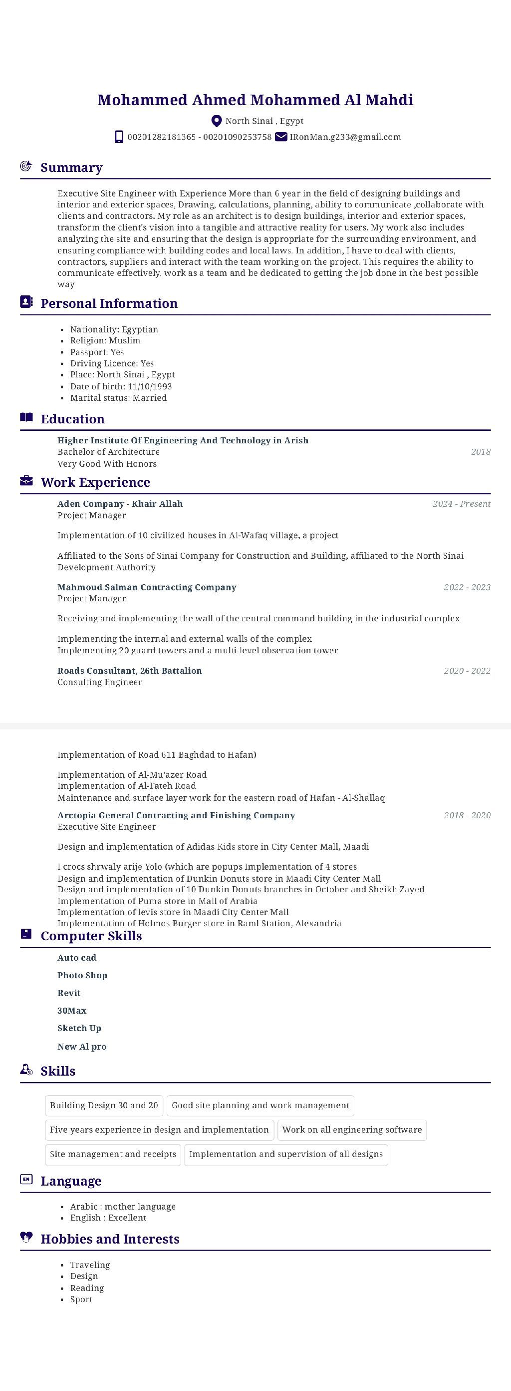 مهندس معماري ومدير مشاريع - خبرة أكثر من 7 سنوات في التصميم والتنفيذ. متخصص في إدارة المواقع الانشائية، بخبرة قوية في المشاريع القومية وتطوير المدن (مثل مشاريع هيئة تنمية سيناء) متمكن من استلام وتنفيذ المباني، والأسوار الأمنية، وأبراج الحراسة. خبرة واسعة في تصميم وتنفيذ المحلات التجارية والتوكيلات العالمية (Adidas Dunkin Donuts, Puma L مهارة عالية في إدارة الفرق والتعامل مع المقاولين والموردين
