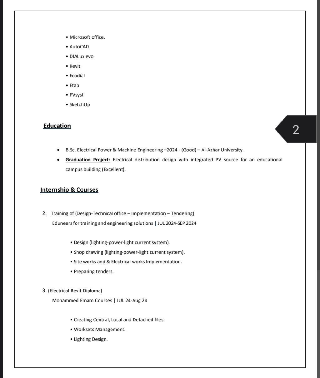 أنا مهندس كهرباء ابحث عن فرصة عمل لدي خبرة في الاشراف على الأعمال الكهربائية بالمواقع وتصميم أنظمة الطاقة الشمسية (PV) واتقان AutoCAD. ابحث عن وظيفة كمهندس كهرباء موقع أو مهندس تصميم طاقة شمسية أو MEP Designer مستعد للتنقل أو العمل عن بعد. متاح للعمل فورا