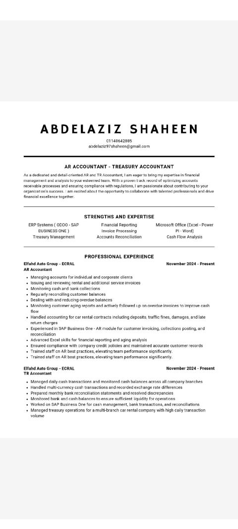 محاسب عملاء وخزينة بخبرة 5 سنوات في شركات التجارة وإيجار السيارات خبرة قوية في إدارة حسابات العملاء والتحصيل واعداد شيتات Aging ومتابعة المتأخرات والتعامل مع حجم كبير من فواتير العملاء والموردين وإدارة الخزينة نقدي وبنوك ومتابعة الايرادات والمصروفات والمشاركة في الإقفالات الشهرية واعداد تقارير مالية للإدارة مع اجادة Excel وأنظمة Odoo وSAP Business One وأسعى لفرصة عمل داخل المملكة العربية السعودية