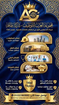 حضراتكم، نود اعلامكم بأن مجموعة العرب للتوظيف - شركة طاقة أصبحت جاهزة لتوفير كافة احتياجاتكم من الكوادر المصرية الموثوقة في جميع التخصصات (مقاولات - نقل - ضيافة - طبي) نلتزم بتقديم اختيارات دقيقة، اجراءات سريعة، وضمان كامل للكفاءة. يسعدنا تزويدكم بأي عدد من العمالة المطلوبة فورا
