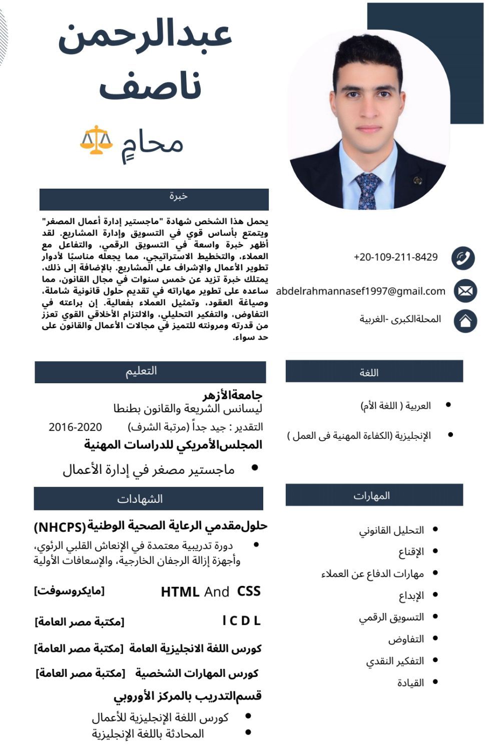 محامي محترف معتمد، بخبرة في القانون الدولي والتمثيل القضائي. ابحث عن فرصة عمل في شركة أو مكتب محاماة دولي في الخارج، مع التركيز على القضايا التجارية والاستثمارية. الخبرة في المحاكم الدولية - تمثيل عملاء في قضايا دولية - صياغة عقود واتفاقيات دولية المؤهلات شهادة في القانون من جامعة الأزهر بتقدير جيد جدا مع مرتبه الشرف - خبرة لا تقل عن 5 سنوات في المحاماة