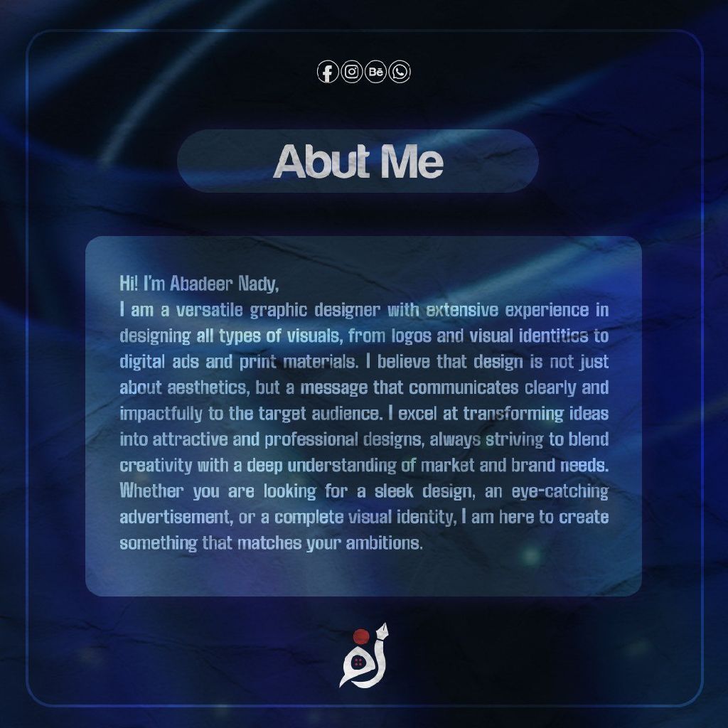 A professional graphic designer offering creative solutions that precisely and professionally meet your business needs. Our services include Logo and visual identity design social media designs Advertising and print materials. We pay attention to every detail to ensure your satisfaction, while adhering to deadlines and high quality standards. For inquiries or to discuss your project, plea