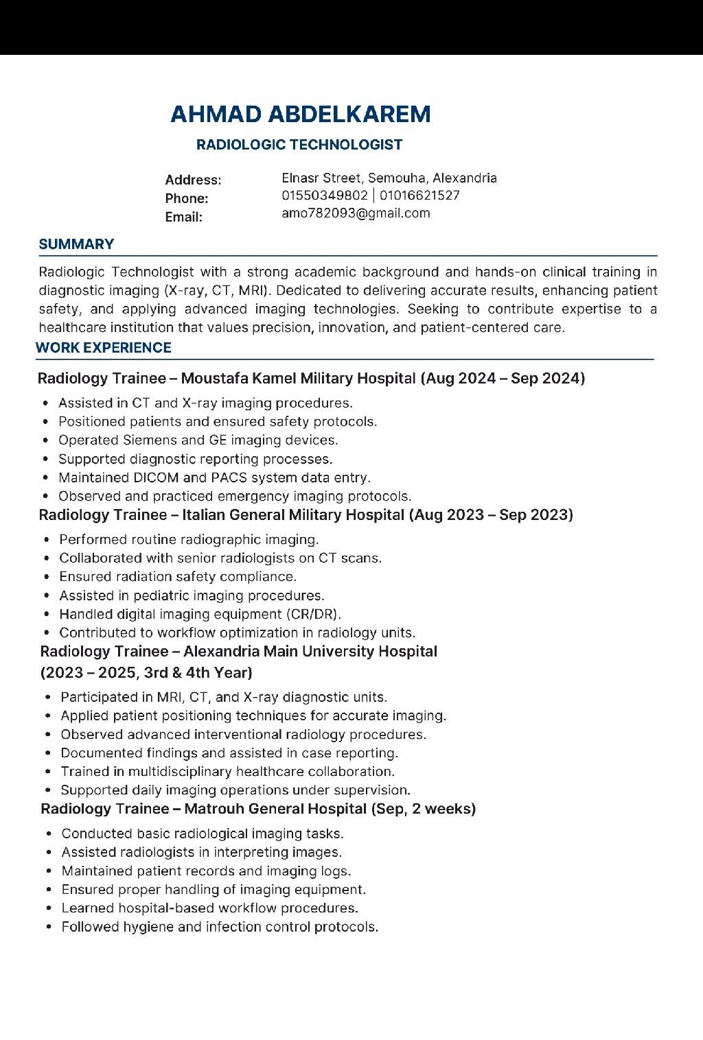 I am a Radiologist, Bachelor of Radiologyandmedicalimagingtechnology) with a CGPA 3.61, experience in Xray and routine CT examinations and learning CM Examinations, and MRI brain, spine looking for work in my beginnings in Saudi or Emirates while preparing for (Data Flow) and prometric for the country)