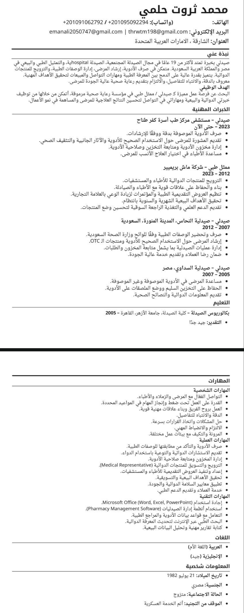 أنا صيدلي مصري مقيم في الامارات خبرة أكثر من 18 سنة في صيدلة المستشفيات والصيدليات المجتمعيه ومندوب بشركات الادوية ومستحضرات التجميل ابحث عن وظيفة تتناسب مع مؤهلاتي فانا معي إقامة سارية لمدة سنتين للتواصل