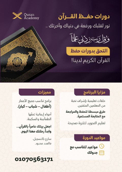 تعلن أكاديمية الارتقاء بالقرآن عبر الانترنت عن استقبال دفعة جديدة من طلاب القرآن الكريم والتربية الاسلامية والتأسيس العربي والانجليزي والماث والمنهج المصري والخليجي للمراحل الدراسية المختلفة للاستفسار والحجز التواصل واتساب فقط ببيانات المتقدم الاسم والعمر والمرحلة الراسية بالتوفيق
