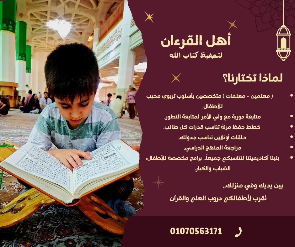 تحفيظ القرآن الكريم لجميع الأعمار نقدم حلقات تعليم القرآن بأسلوب مبسط يناسب الاطفال والشباب والكبار. تحفيظ القرآن خطوة بخطوة تصحيح التلاوة واحكام التجويد خطط حفظ تناسب قدرات كل طالب متابعة مستمرة مع الطلاب وأولياء الامور حلقات اونلاين مرنة هدفنا أن نكون سببا في نشر نور القرآن وبناء جيل من أهل القرآن