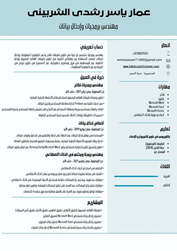 مهندس برمجيات وتطبيقات ادخال بيانات 3 سنوات خبرة متاح للعمل في الرياض أنا عمار ياسر رشدي الشريني مهندس برمجيات بخبرة 3 سنوات في تطوير تطبيقات Flutter وتكاملها مع قواعد البيانات مثل Firebase بالاضافة الى خبرة قوية في مجال ادخال البيانات باستخدام برامج Microsoft Office (Excel, Word, Access) شاركت في عدة مشاريع لتصميم وتطوير تطبيقات موبايل، وتنفيذ مشاريع في مجال ادخال بيانات