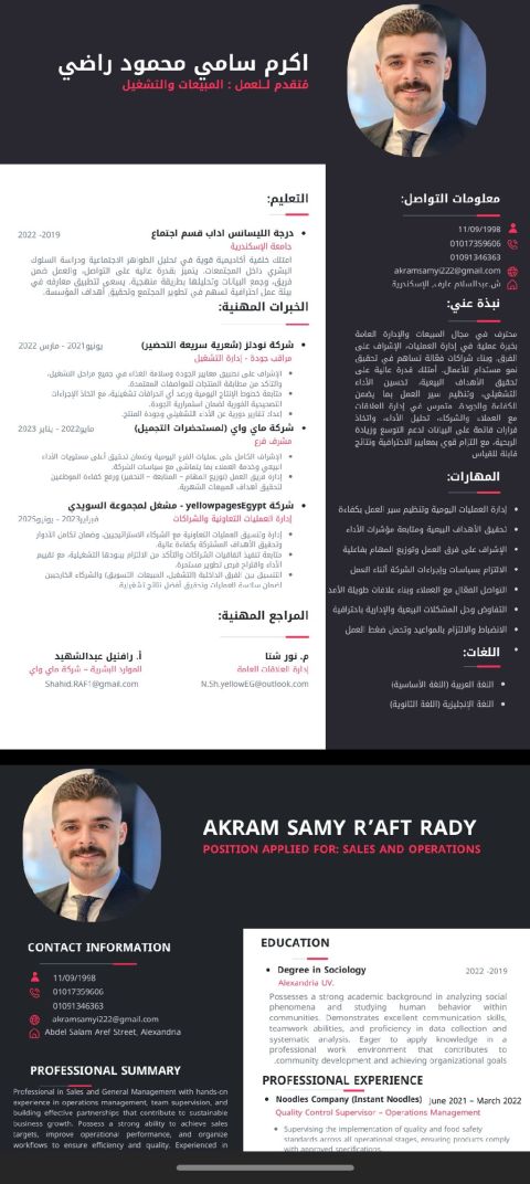مدير مبيعات طموح ولديه أفكار جديدة بالتسويق والبيع بكالوريوس تجارة ادارة أعمال ومستوى جيد باللغة الانجليزية وقادر على قيادة فريق وتكوين فريق مبيعات محترف وعمل الخطط التسويقية ومتابعة الأسواق وتنفيذ الخطط خبرة بالمجالات التالية المواد الغذائية والعصاير والخضار والفواكه والأعلاف والاجهزة الكهربائية والتكييف والأدوات المنزلية والمستلزمات الطبية والتعامل مع كبرى الشركات والسوبر ماركت وجاهز للعمل فورا