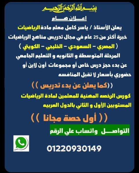 مصطفى حاصلة علي / بكالوريوس علوم وتربية خريجة / تربية عام قسم رياضيات جامعة سوهاج عن فتح باب الحجز للترم الثاني في مادة الرياضيات منهج مصري وسعودي واماراتي وكويتي وقطري الشرح عبر برنامج zoom امتحانات كل حصة متابعه كل حصة مع ولي الأمر للتواصل الاتصال على الرقم