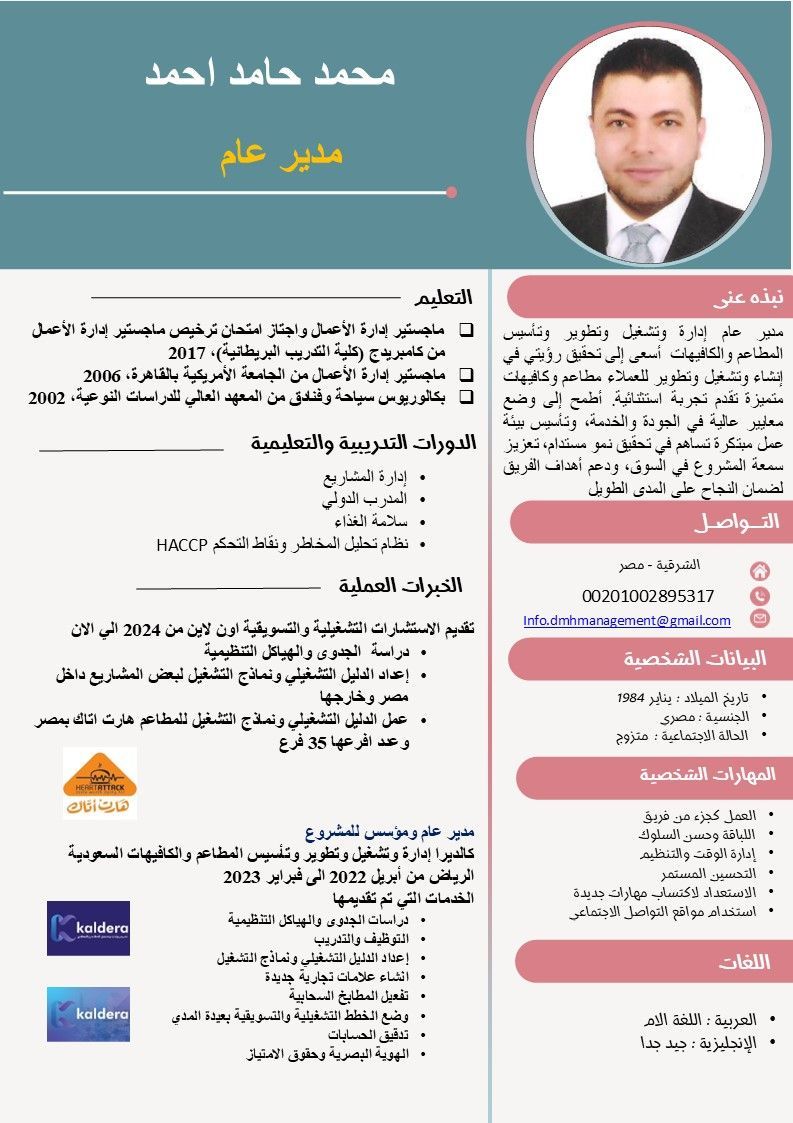 مدير عام ومدير تشغيل حاصل علي شهادات عليا في إدارة الأعمال والسياحة والفندقة مع خبرة أكثر من 15 سنة في دبي والرياض خبرة كبيرة في تأسيس وتشغيل وتطوير وإدارة المطاعم والكافيهات والمشاريع الأخري خبرة كبيرة في دراسات الجدوى والهيكل التنظيمي وشركات التوصيل والدعاية والاعلان والمطابخ السحابية معي تأشيرة دخول عمل وجاهز للسفر في أقرب وقت ممكن