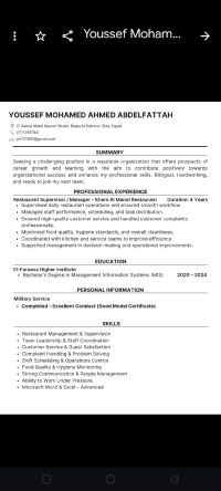 الاسم/ يوسف محمد. السن / 24. اشتغلت وايتر + كابتن اوردر + مدير صالة خبرة 4 سنوات في المطعم المؤهل بكالوريوس نظم المعلومات الاداريه