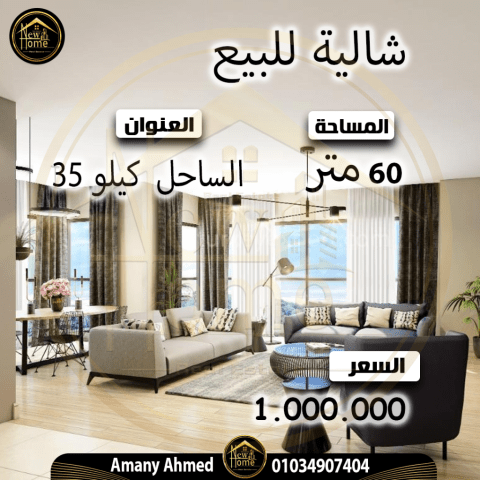 59 SQM Apartment for sale - North Coast, KM 35 Manager Amani Ahmed 01034907404 - 1 Bedroom + 2 Reception Rooms + 1 Bathroom + 1 Kitchen - 1st Floor - 1 Elevator - Licensed - Super Lux Finishing - Electricity/ Water Meters Installed - Cash 1000000 - Code 0146