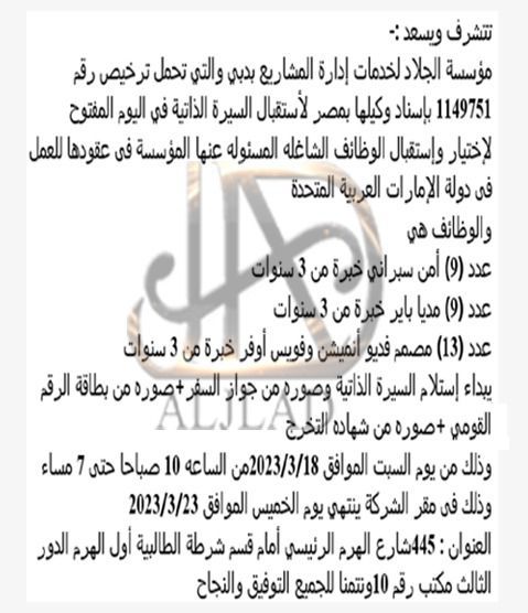 مطلوب أفراد أمن اداري / مشرفين لتوكيل سيارات حي الاسمرات / دائري المعادي / شبرا الخيمة / العبور / نفق السخنه شيفت 12 ساعة. السن 20 - 45. الراتب للمشرف 8000 على 26 يوم عمل وال 30 يوم 9000 - الراتب 7000 على 26 يوم عمل وأل 30 يوم 8000 للتواصل ( أ ياسمين مديرة تعيينات)