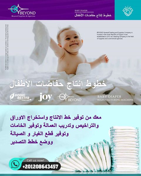 دراسة جدوى مفصلة متكاملة لمصنع انتاج حفاضات اطفال توفير خطوط انتاج حفاضات الاطفال والفوط والمناديل تدريب عمالة. توفير الخامات - توفير قطع الغيار والصيانة - خطط تصدير