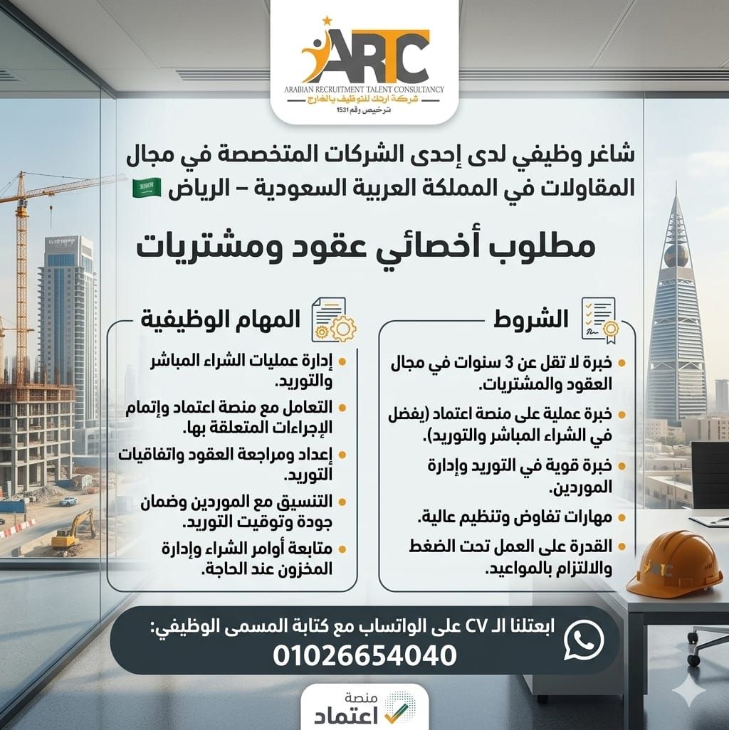 شاغر وظيفي لدى احدى شركات المتخصصة في مجال المقاولات في المملكة العربية السعودية - الرياض "مطلوب أخصائي عقود ومشتريات" الشروط خبرة لا تقل عن 3 سنوات في مجال العقود والمشتريات. خبرة عملية على منصة اعتماد (يفضل في الشراء المباشر والتوريد) خبرة قوية في التوريد وإدارة الموردين. مهارات تفاوض وتنظيم عالية. القدرة على العمل تحت الضغط والالتزام بالمواعيد. المهام الوظيفية إدارة عمليات الشراء المباشر والتوريد