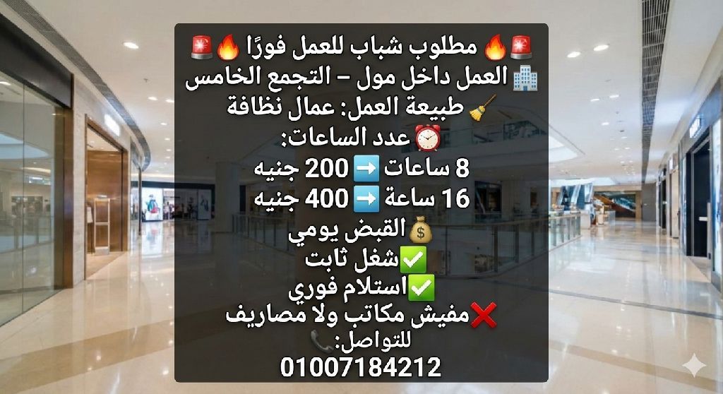 مطلوب شباب للعمل فورا في مول بالتجمع الخامس الوظيفة عمال نظافة القبض يومي مواعيد العمل 8 ساعات 200 جنيه 16 ساعة 400 جنيه شغل ثابت استلام شغل فوري مفيش مكاتب - مفيش نصب للتواصل