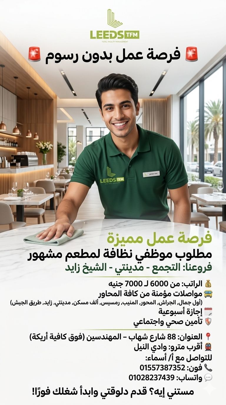 فرصة شغل بدون رسوم مطلوب موظفين نظافة للعمل في مطعم مشهور بالتجمع - مدينتي - الشيخ زايد الراتب 6000 - 7000 جنيه يوم إجازة في الأسبوع تأمين صحي واجتماعي العنوان 88 شارع شهاب - المهندسين (فوق كافية أريكة) أقرب مترو وادي النيل