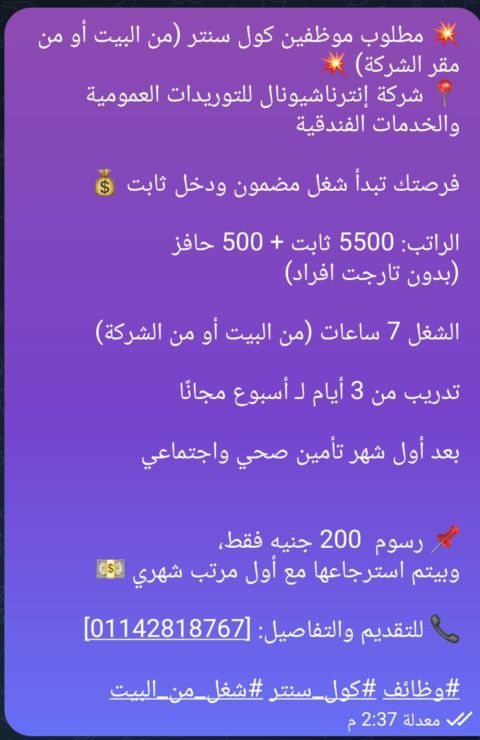 مطلوب موظفين كول سنتر (من البيت أو من مقر الشركة) شركة أنترناشيونال للتوريدات العمومية والخدمات الفندقية فرصتك تبدأ شغل مضمون ودخل ثابت الراتب 5500 ثابت + 500 حافز (بدون تارجت أفراد) الشغل 7 ساعات (من البيت أو من الشركة) تدريب من 3 أيام ل أسبوع مجانا بعد أول شهر تأمين صحي واجتماعي رسوم 200 جنيه فقط، وبيتم استرجاعها مع أول مرتب شهري للتقديم والتفاصيل
