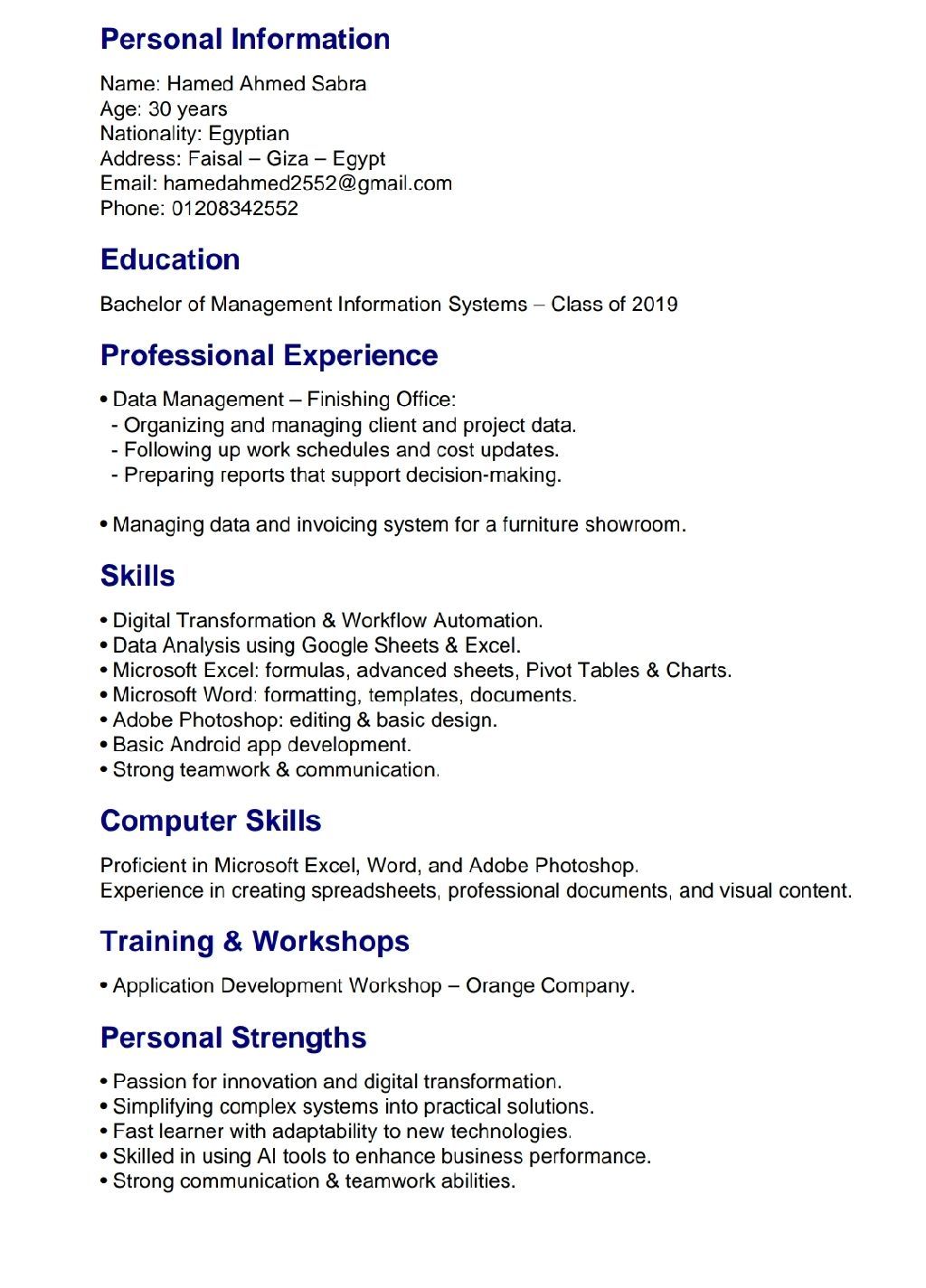 ابحث عن فرصة عمل لدي خبرة في إدارة البيانات داخل مكتب تشطيبات، وتشمل تسجيل البيانات، ترتيب الملفات، ومتابعة خطط العمل. كما لدي خبرة في نظام الفواتير داخل معرض أثاث وتنظيم حركة البيانات اليومية. المهارات Excel Word Google Sheets Power BI SQL تنظيم البيانات بدقة وسرعة متابعة المهام وتحمل ضغط العمل سرعة في الكتابة على الكمبيوتر المؤهل بكالوريوس نظم معلومات