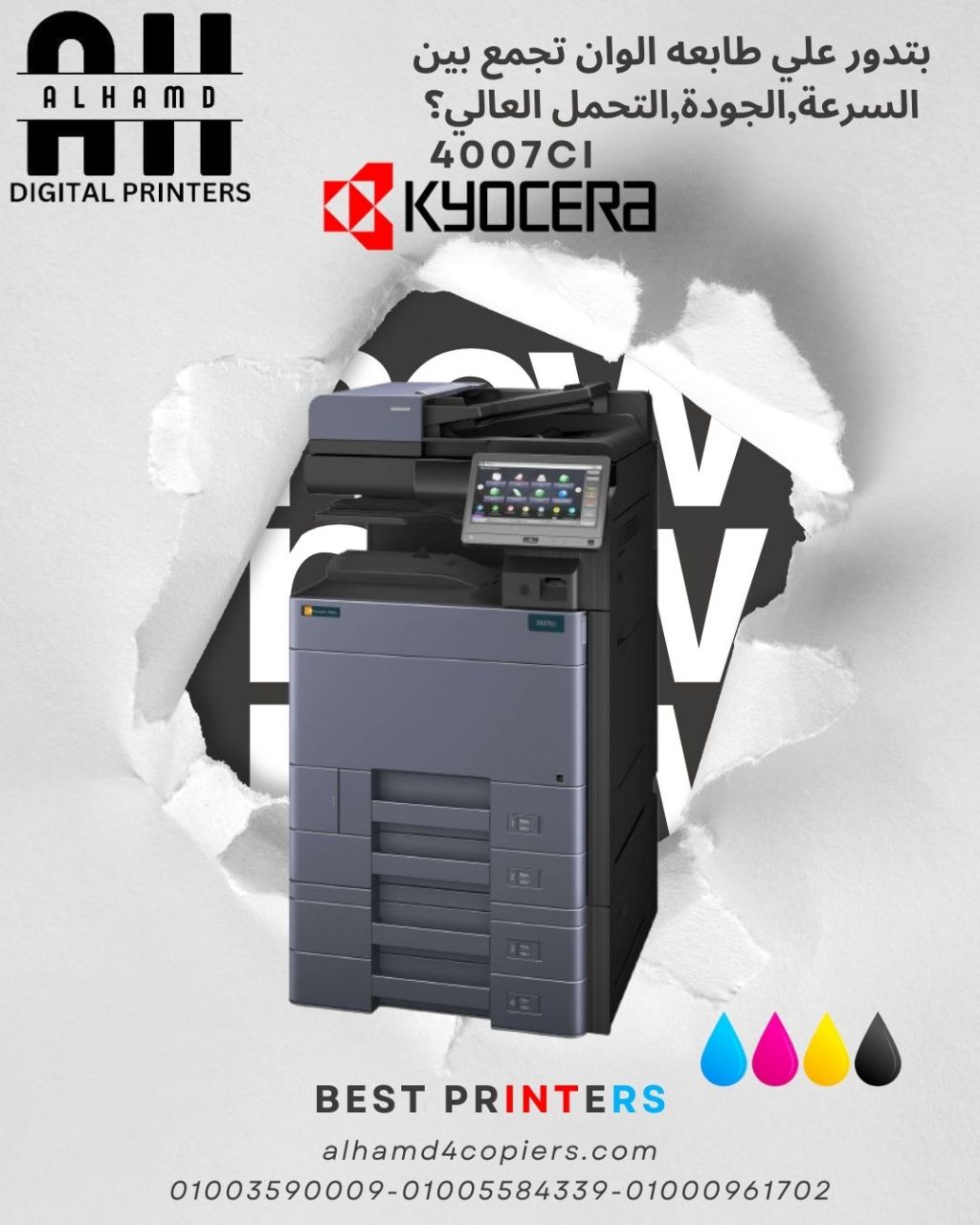 ماركة كيوسيرا صناعة ألماني. الموديل 4007 ci. السرعة 40 نسخة في الدقيقة. دقة الطباعة 1200*1200 DPI. وضوح التصوير 600*600 DPI. مقاس الورق A5 & A4 & A3. وزن الورق من 60 الى 300 جرام. عدد النسخ الممكن انتاجها بضغطة واحدة 1 - 999 نسخة. التكبير والتصغير من 25% الى 400% (الزيادة والنقص ب 1% شاشة تاتش الوان. سعة الدرج 500 ورقة. مداحل الطباعة USB + NETWORK. شاشة لمس ملونة مخرج للطباعة مباشرة