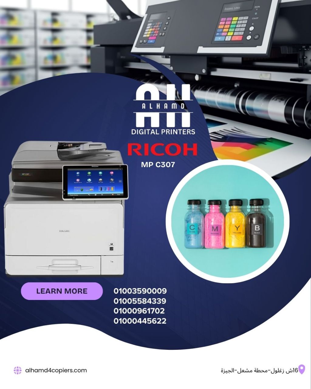 شركة - الحمد - لمهمات - المكاتب Ricoh mp c307 السرعة 30 نسخة/ دقيقة. الطباعة بكثافة 1200 dpi, 1200 dpi زمن التسخين 23 ث مقاس الورق من A4 A5 نسبة ألزوم 25% الى 400%. وزن الورق المستخدم حد أقصى 163 جرام الا له بها فيدر لتصوير الأصول أوتوماتيكيا امكانية تصوير علي الوجهين أوتوماتيكيا (الوش والظهر) حتى 99 نسخة بالمسة واحدة. الا له بها خاصية الكتيب وتوزيع الملزمات وزن الورق وزن الورق 220 الى 60 جرام تواصل