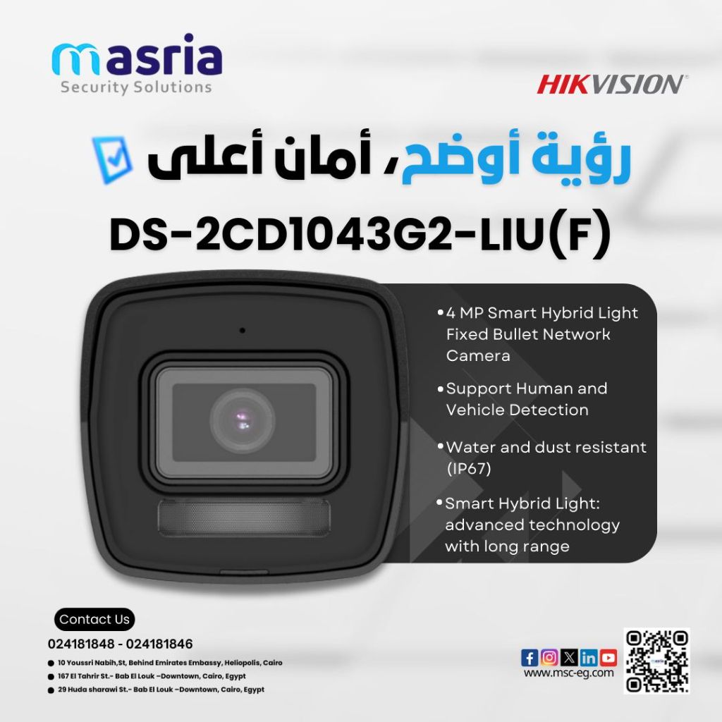 عايز تركب كاميرا تريحك وتحسسك في الأمان بجد كاميرا Hikvision DS - 2CD1043G2 - LIU ( F جاهزة تخليك مطمن صورة بجودة عالية بدقة 4 ميجا بيكسل بتميز بين الانسان والعربية بسهولة فيها تكنولوجيا Smart Hybrid Light على شان الصورة تبقي واضحة حتى في الضلمة مايك مدمج على شان تسمع كل حاجة لحظة بلحظة ضد المية والتراب (IP67) يعني مستحملة كل الظروف تدعم كارت ميموري لحد 512 جيجا (اختياري) وتقنية H 265 + اللي بتوفر لك مساحة تخزين