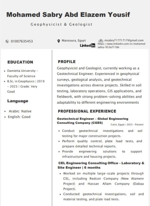 أريد وظيفة في مجال الجيولوجيا أو الجيوفيزيا أنا خريج 2023 بتقدير جيد جدا أنا عندي خبرة في مجال التربة والخرسانة والطرق اشتغلت في مكاتب في القاهرة استشاري جودة طرق وخرسانة واشتغلت مهندس جودة خرسانة في محطة خرسانة وملم بكل اختبارات التربة والخرسانة وجودة الخرسانة وحاليا بعمل دراسات عليا في مجال الخرسانة وأنا طموح جدا شكرا جزيلا لكل من يرى الاعلان