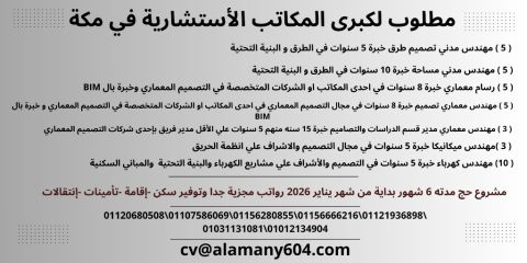 وظائف شركة الأماني لالحاق العمالة بالخارج ترخيص 604 مطلوب لكبرى المكاتب الاستشارية في مكة مهندسين (مدني - معماري - ميكانيكا - كهرباء - رسام معماري)