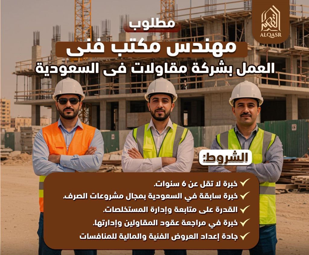 مطلوب (مهندس - مكتب - فني) للعمل بشركة مقاولات كبرى في السعودية - الدمام الشروط خبرة لا تقل عن 6 سنوات. خبرة سابقة في السعودية بمجال مشروعات الصرف. القدرة على متابعة وإدارة المستخلصات. خبرة في مراجعة عقود المقاولين وادارتها. اجادة اعداد العروض الفنية والمالية للمنافسات. للتقديم يرجى إرسال السيرة الذاتية مع كتابة "المسمي الوظيفي" واتساب الايميل