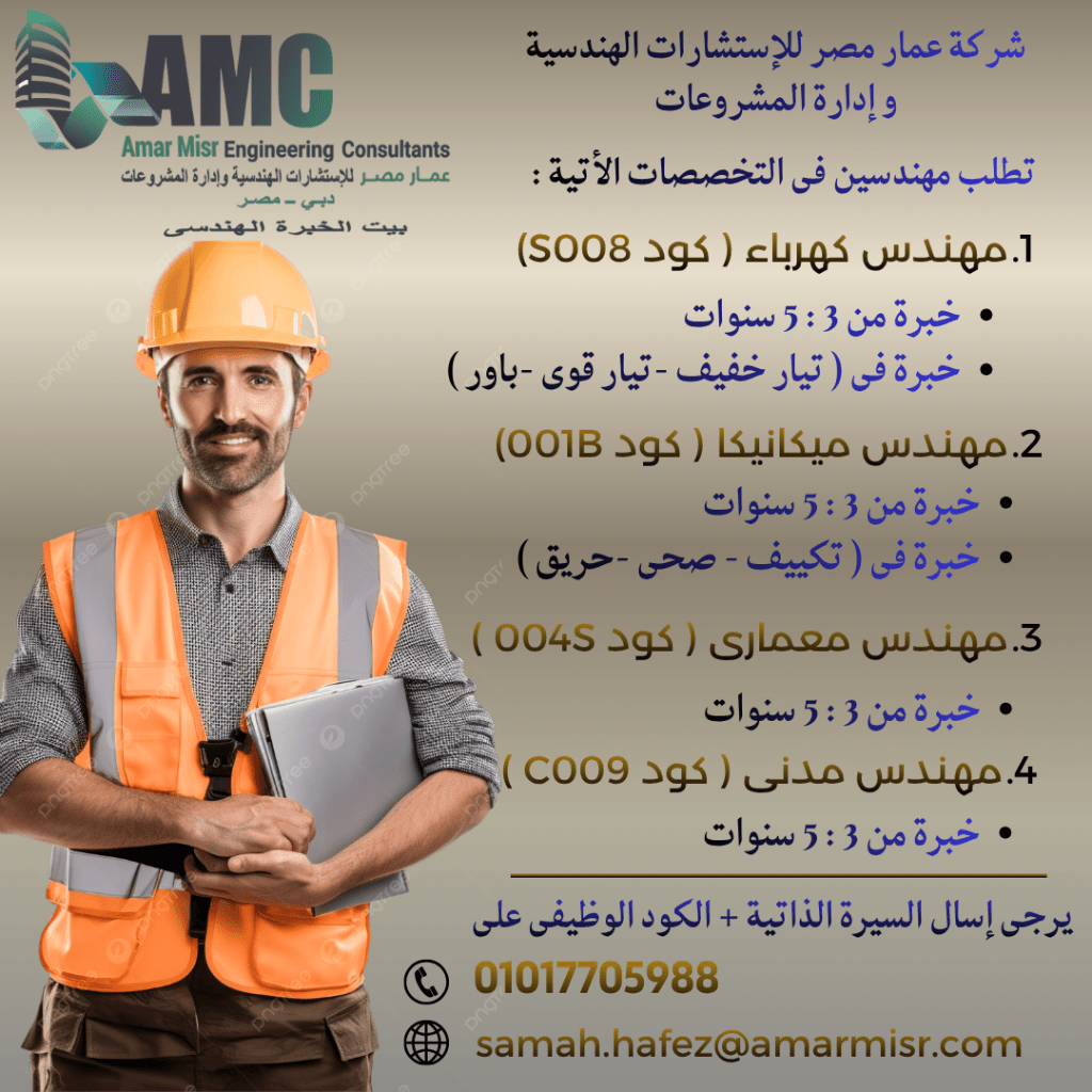 مطلوب مهندسين (كهرباء - ميكانيكا - معماري - مدني) الخبرة لا تقل عن 3 5 سنوات في القاهرة العاصمة الادارية برجاء أرسل السيرة الذاتية + الكود الوظيفي الموجودة بالاعلان