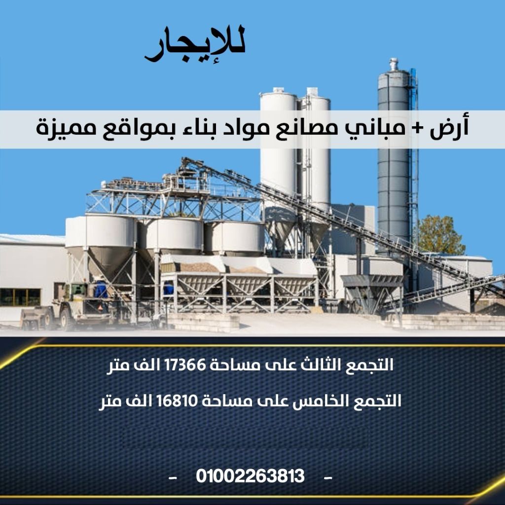 للبيع أو الإيجار أرض + مباني + محطات خرسانة جاهزه موقع مميز جدا في القاهرة الجديدة المنطقة الصناعية التجمع الثالث طريق المحاجر تخصيص مصنع - خرسانة - جاهزه مساحة الأرض 17366م مقام عليها الآتي 1 - مبنى اداري 2 - مبنى خدمات 3 - غرف أمن 4 - مسجد 5 - محطتين خلط خرسانة لمزيد من المعلومات عقارات - البيك