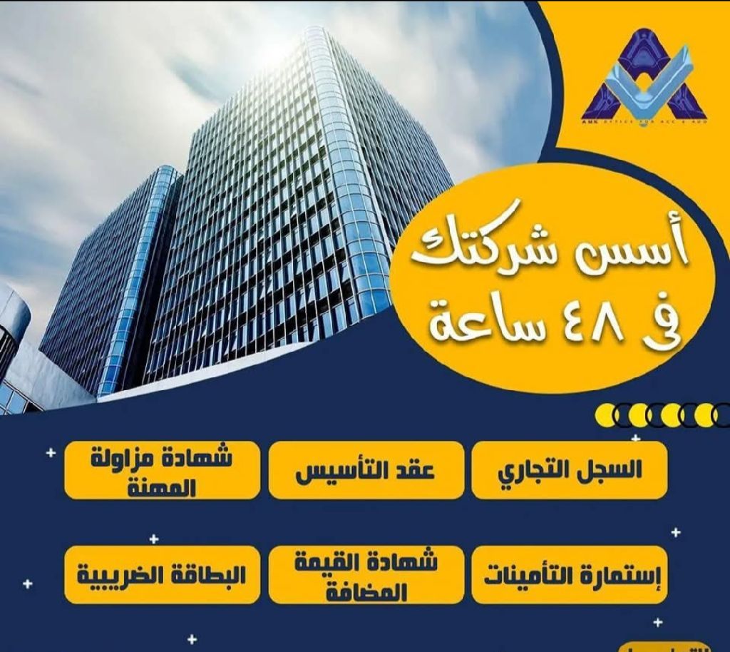 أسس شركاتك في 48 ساعة 1 - السجل التجاري 2 - عقد التأسيس 3 - شهادة مزاولة المهنة 4 - استمارة التأمينات 5 - شهادة القيمة المضافة 6 - البطاقة الضريبيه