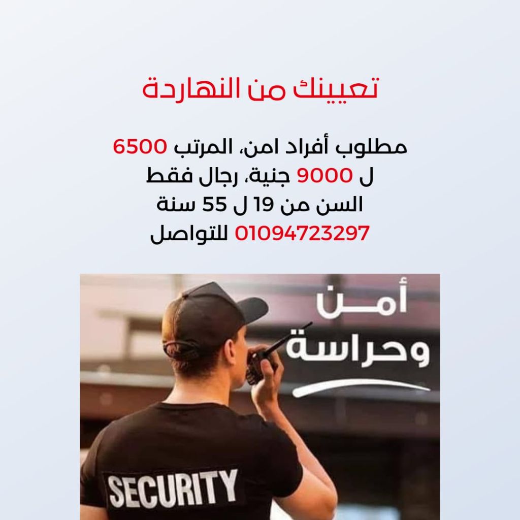 مطلوب أفراد أمن للتعيين الفوري في القاهرة ونواحيها. المميزات سكن. مواصلات من السكن للموقع. يونيفورم. وجبة في بعض المواقع. تأمين طبي واجتماعي. سلف من يوم 20 ل 23. القبض من يوم 7 ل 10 للتواصل من 9 ل 5