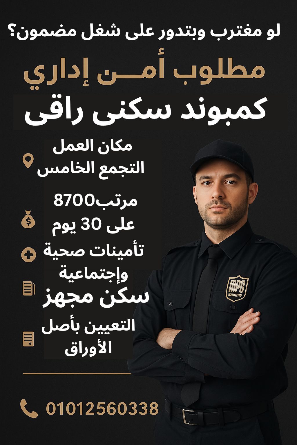 فرصة عمل فورية - أفراد أمن لكمبوند راق بالتجمع الخامس مطلوب أفراد أمن للعمل في كمبوند سكني راق بالتجمع الخامس 12 ساعة عمل يوميا 25 يوم عمل + 5 أيام إجازة المرتب 7500 جنيه الشهر الكامل 8700 جنيه السن من 18 الى 50 سنة يشترط اجادة القراءة والكتابة سكن مجهز بالكامل جديد تأمين صحي واجتماعي للتواصل الفرصة محدودة - التعيين فوري بدون رسوم التعيين فوري وبدون أي رسوم