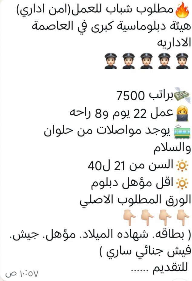 مطلوب أفراد أمن لهيئة دبلوماسيه في العاصمة الادارية الجديدة بمرتب 7500ج عمل 22 يوم و8 أيام اجازة السن من 21 سنة ل 45 سنة الأوراق أقل شهادة دبلوم