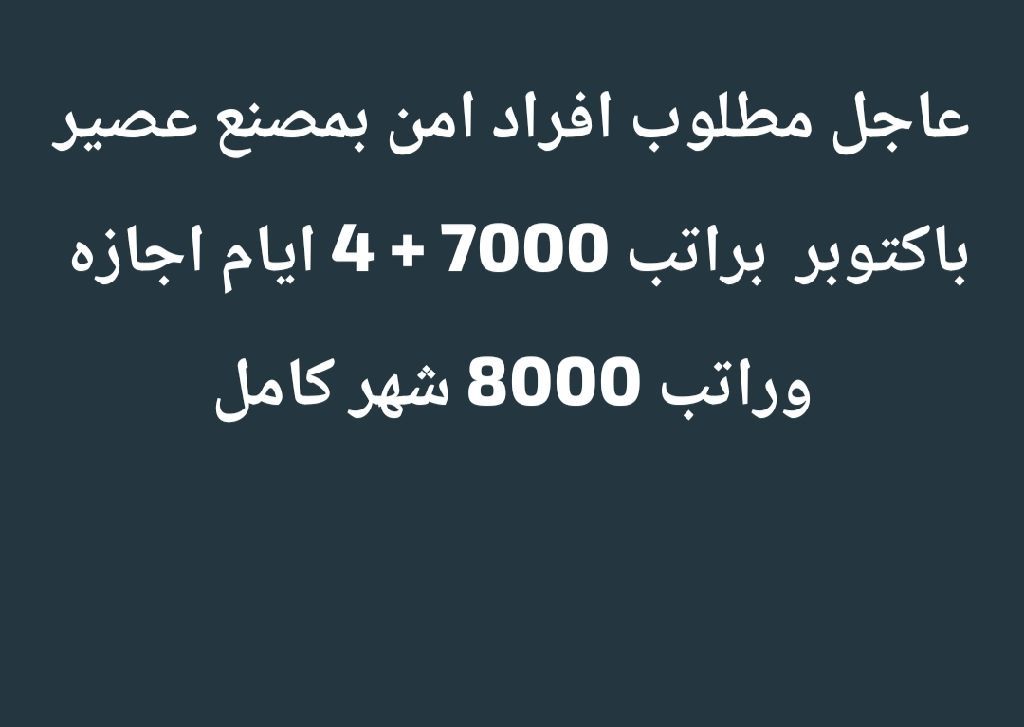 عاجل مطلوب أفراد أمن لشركة أمن نقل الأموال في كمبوند سكني ساكن بالكامل بالتجمع الخامس راتب صافي 8500ج في 26 يوم عمل و4 أيام اجازة راتب صافي 9700ج في 30 يوم عمل 12 ساعة عمل تأمين طبي واجتماعيا لسن 21 ل 45 متوفر سكن مجهز بالكامل + مواصلات من السكن للموقع والعكس شرط الطول لا يقل عن 175 مع تناسق اللياقة البدنية الأوراق أصل شهادة الميلاد وفيش جنائي وموقف من التجنيد وأقل مؤهل دبلوم للتواصل