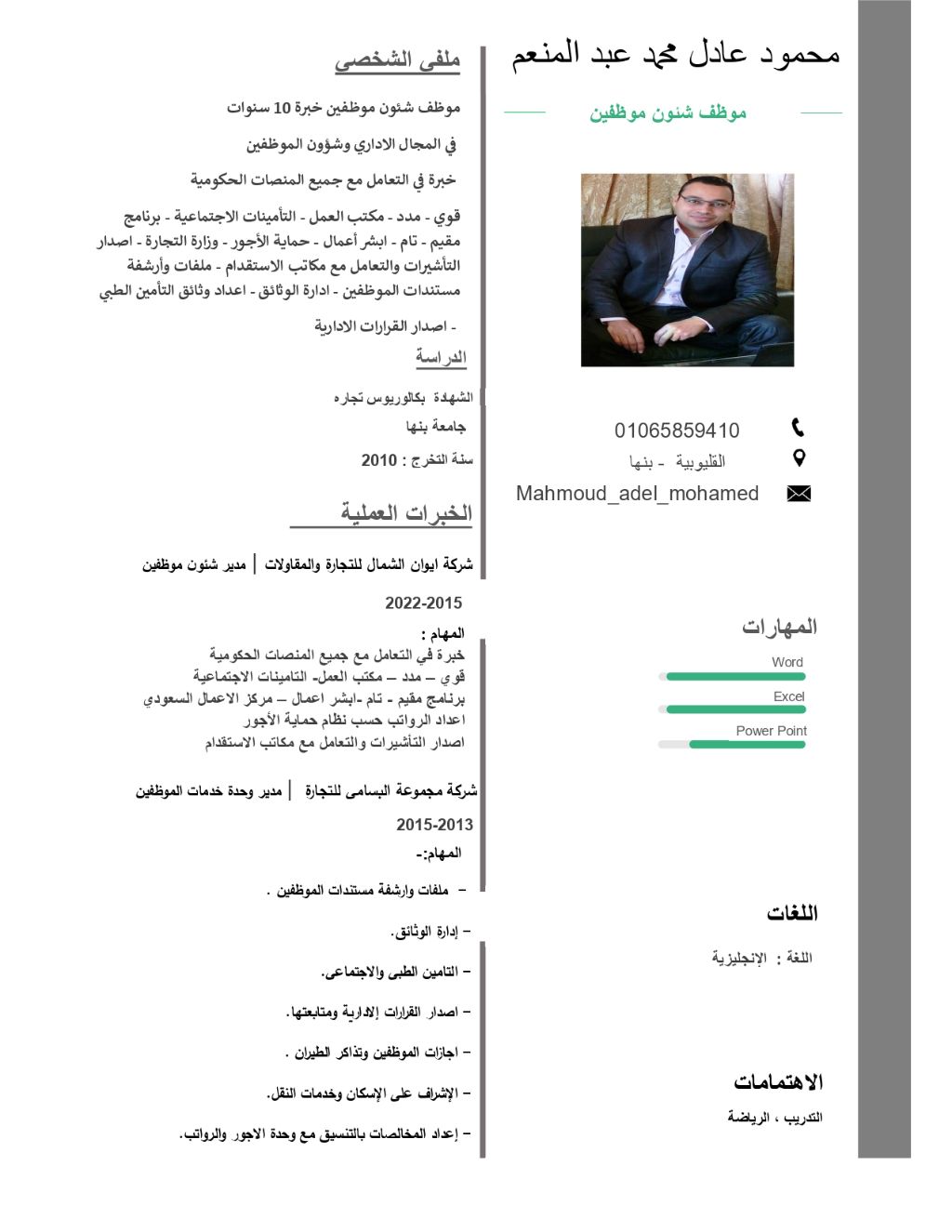 موظف شؤون موظفين خبرة 10 سنوات في المجال الاداري وشؤون الموظفين خبرة في التعامل مع جميع المنصات الحكومية قوي - مدد - مكتب العمل - التأمينات الاجتماعية - برنامج مقيم - تام - ابشر أعمال - حماية الأجور - وزارة التجارة - اصدار التأشيرات والتعامل مع مكاتب الاستقدام - ملفات وأرشفة مستندات الموظفين - ادارة الوثائق - اعداد وثائق التأمين الطبي - اصدار القرارات الادارية
