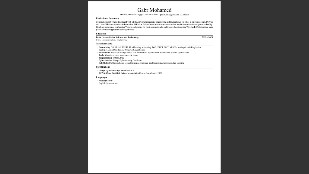 مهندس اتصالات / شبكات / IT - حديث التخرج - متاح للعمل مهندس اتصالات حديث التخرج ابحث عن فرصة عمل في مجال الشبكات (Network Engineer) أو تقنية المعلومات (IT support / IT Administrator) أو الاتصالات. المؤهلات بكالوريوس هندسة اتصالات دراسة قوية في مجال الشبكات (Routing & Switching - أساسيات LAN / WAN) انهاء دراسة CCNA شهادة Google Cybersecurity معرفة جيدة بأنظمة Windows Server وActive Directory أساسيات