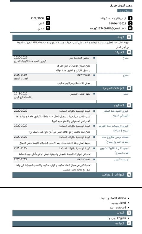أنا محتاج شغل في مجال المقاولات خبرة فوق 5 سنين في محطات خط الكهرباء السريع ومجال الانشاءات في شركات اوراسكوم وأبناء حسن علام بالاضافة الى شغل في الاند سكيب والهارد سكيب في 6 أكتوبر