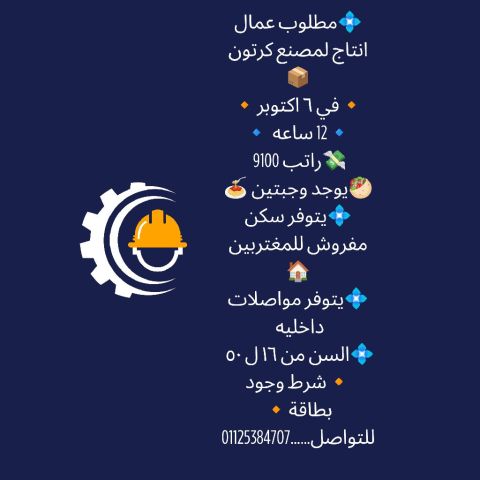 مطلوب عمال انتاج لمصنع كرتون في 6 أكتوبر 12 ساعة راتب 9100 يوجد وجبتين يتوفر سكن مفروش للمغتربين يتوفر مواصلات داخليه السن من 18 ل 50 شرط وجود بطاقة